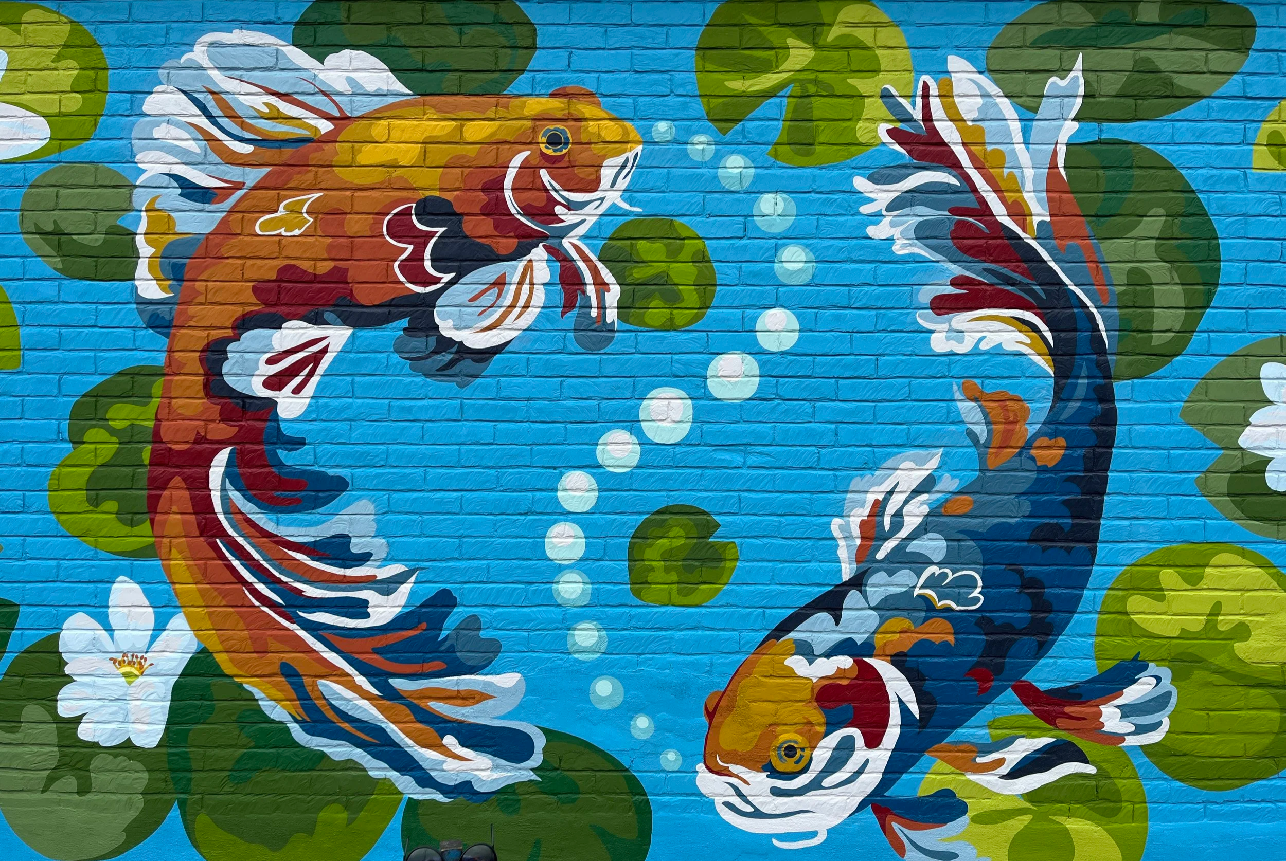 A harmonious koi fish duo, the pair swims through white lotus flowers while blowing bubbles to create a subtle yin & yang symbol with the lily pads.